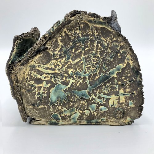 19” catalpa pods pierce the potbelly faux bois vessel form. The interior’s glossy turquoise is offset by the exterior matte finish of Homestead Heart slip glaze with a rubbing of unfired hand-harvested homestead clay.